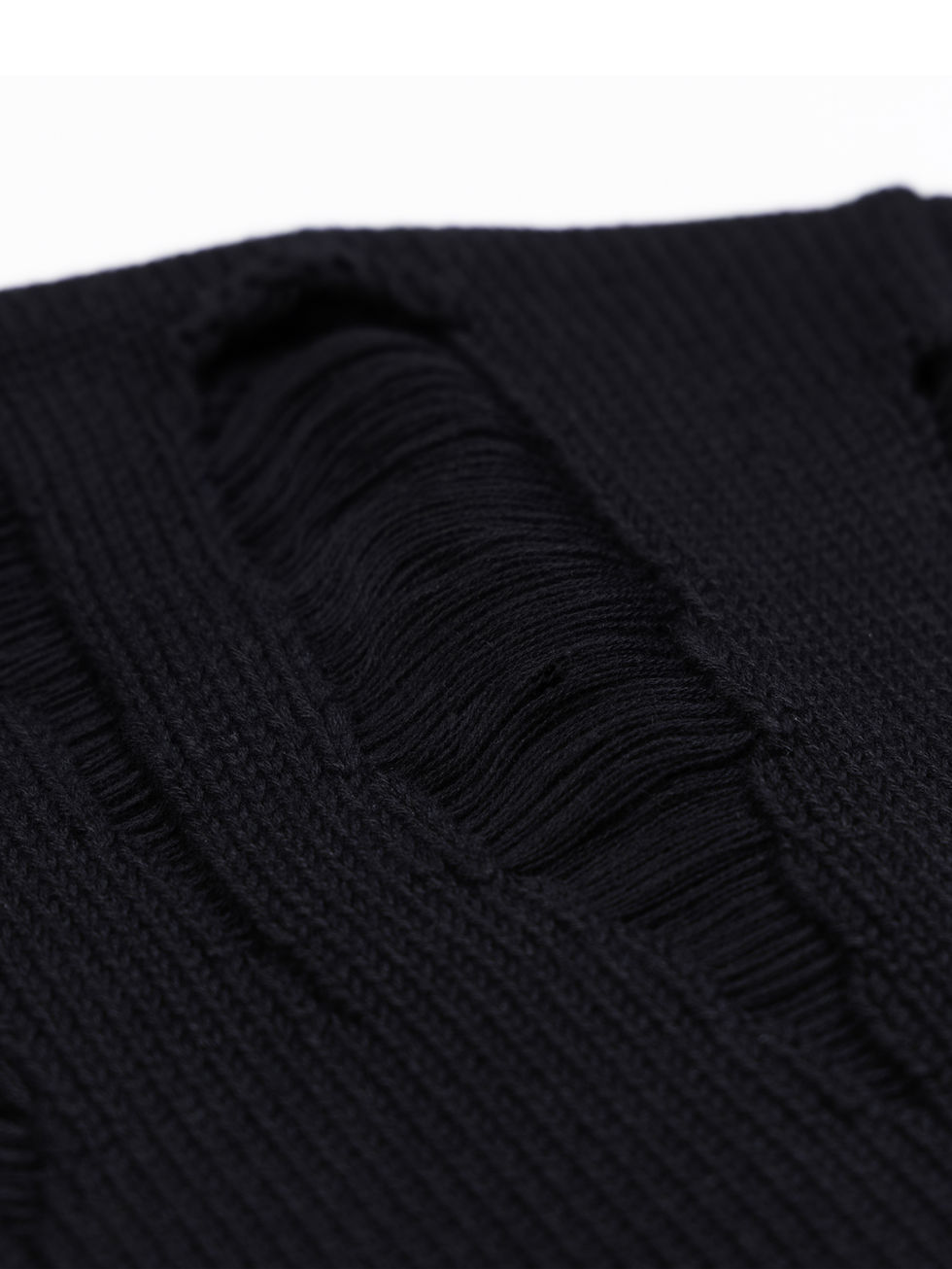 The design features subtle distress details throughout, with small, intentional holes that create a worn-in, lived aesthetic without compromising the integrity of the garment.